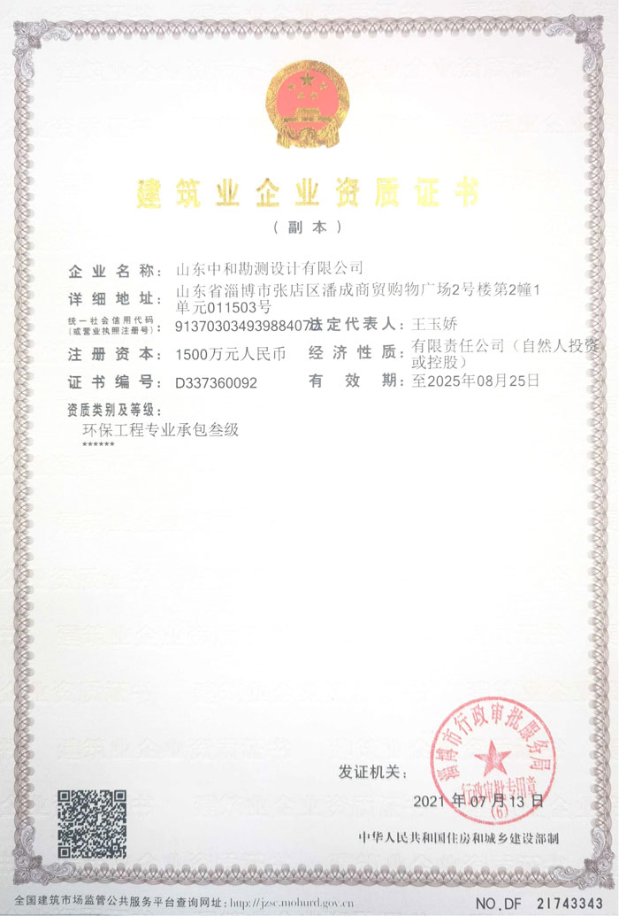 2021年7月13日,公司经过人员整合、资料整理、认真准备,成功办理环保工程专业施工资质。