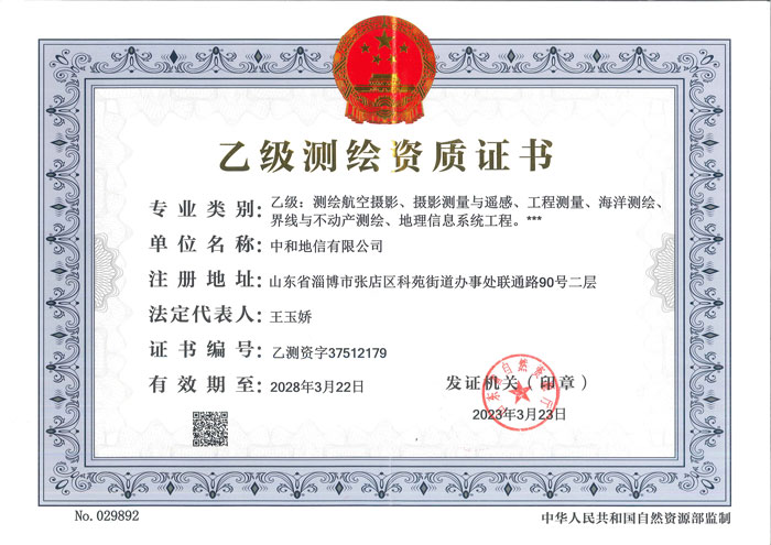 2023年3月23日,公司经过人员整合、资料整理、认真准备,成功办理测绘乙级资质。