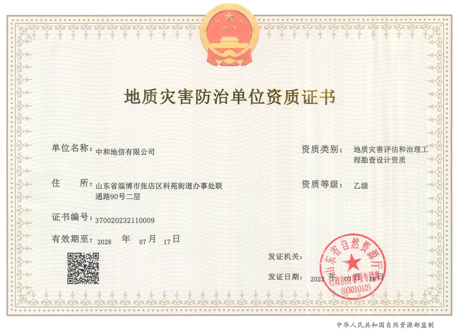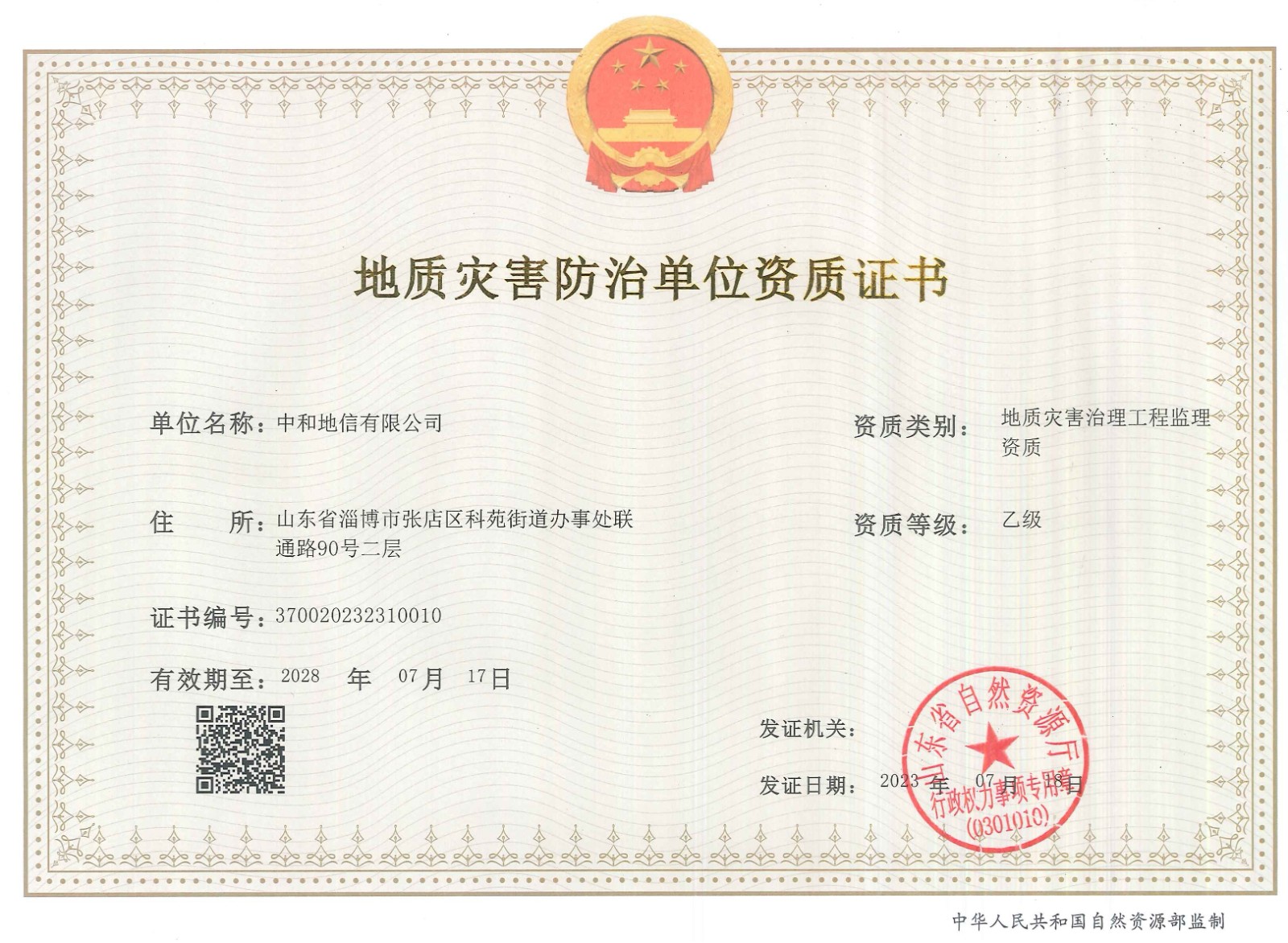 2023年7月18日,公司经过人员整合、资料整理、认真准备,成功办理地质灾害防治单位乙级资质证书。